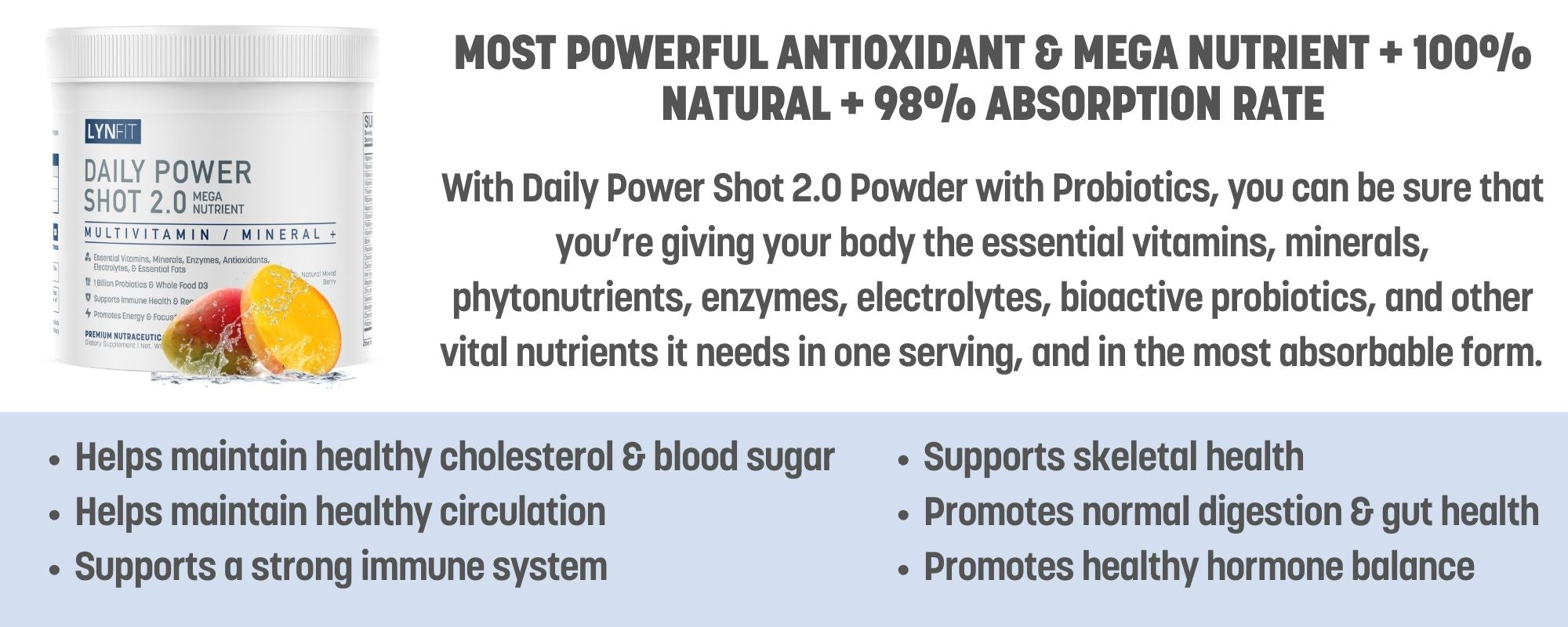 Daily Power Shot 2.0 Powder is the most potent antioxidant supplement today. It's 100% natural and has a 98% absorption rate.