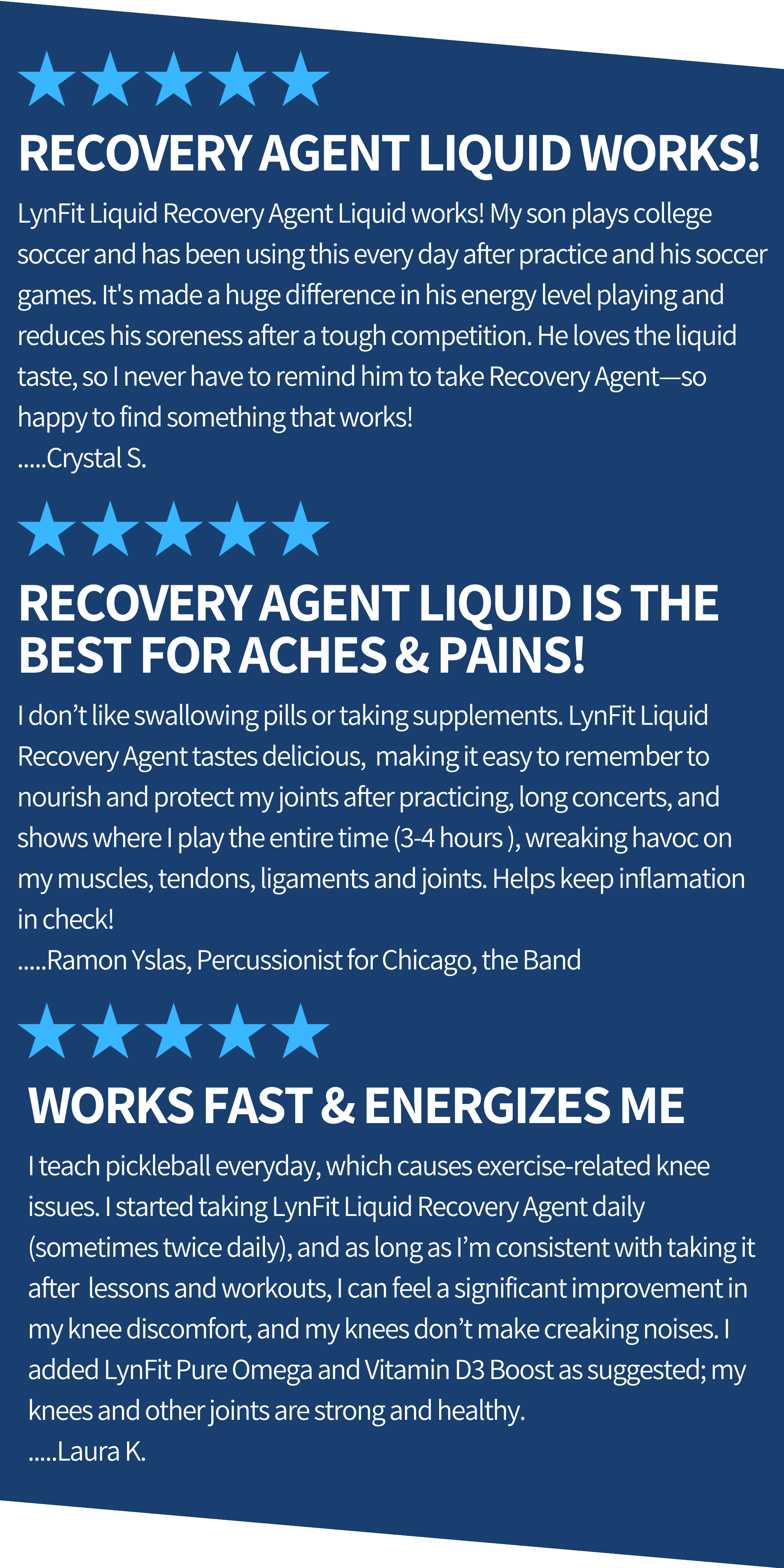 It works! Men, women, and teens regularly tell us that Recovery Agent Liquid helps relieve their aches and pains, prevents flair-ups provoked by aging, inflammatory diet (alcohol), repetitive physical stress, and overuse that workouts, golf, pickleball, tennis, running, hiking, or even yard/housework, or acute injury, can cause. Many of them have tried other joint-protective supplements, CBD, or over-the-counter pain relief products with unsatisfactory results, elevated blood sugar and blood pressure levels, weight gain, and even liver and kidney damage.