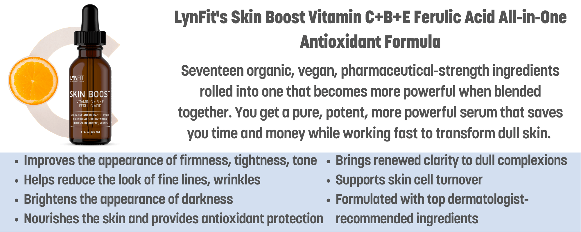 If you want healthier, firmer skin that glows, fewer crows feet, and want to even out skin tone, alleviate the dark undereye circles or moisture, and make your skin look instantly better without causing breakouts, you're going to love LynFit's Skin Boost Vitamin C+B+E Ferulic Acid All-in-One Antioxidant Formula. It nourishes, protects, and rejuvenates dull, dry skin into brighter, tighter, more plump, healthy-looking skin.