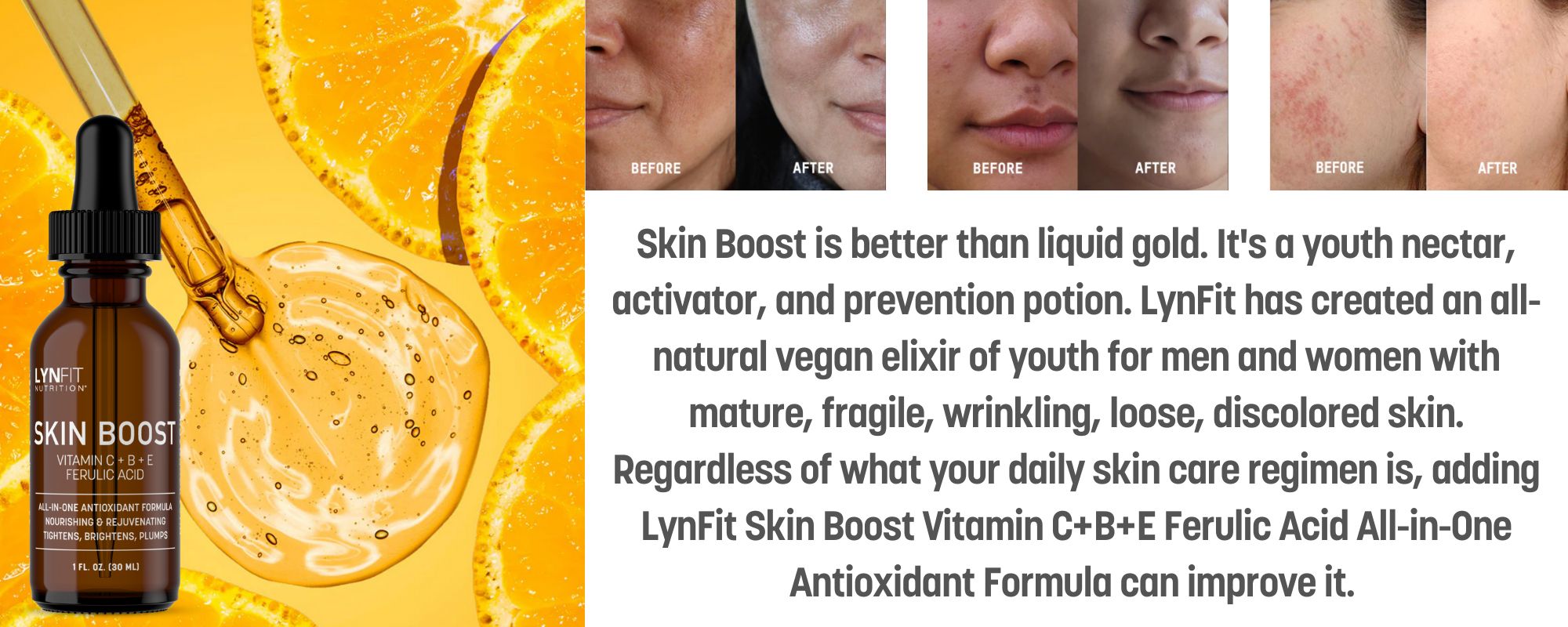 Skin Boost is better than liquid gold. It's a youth nectar, activator, and prevention potion. LynFit has created an all-natural vegan elixir of youth for men and women with mature, fragile, wrinkling, loose, discolored skin.