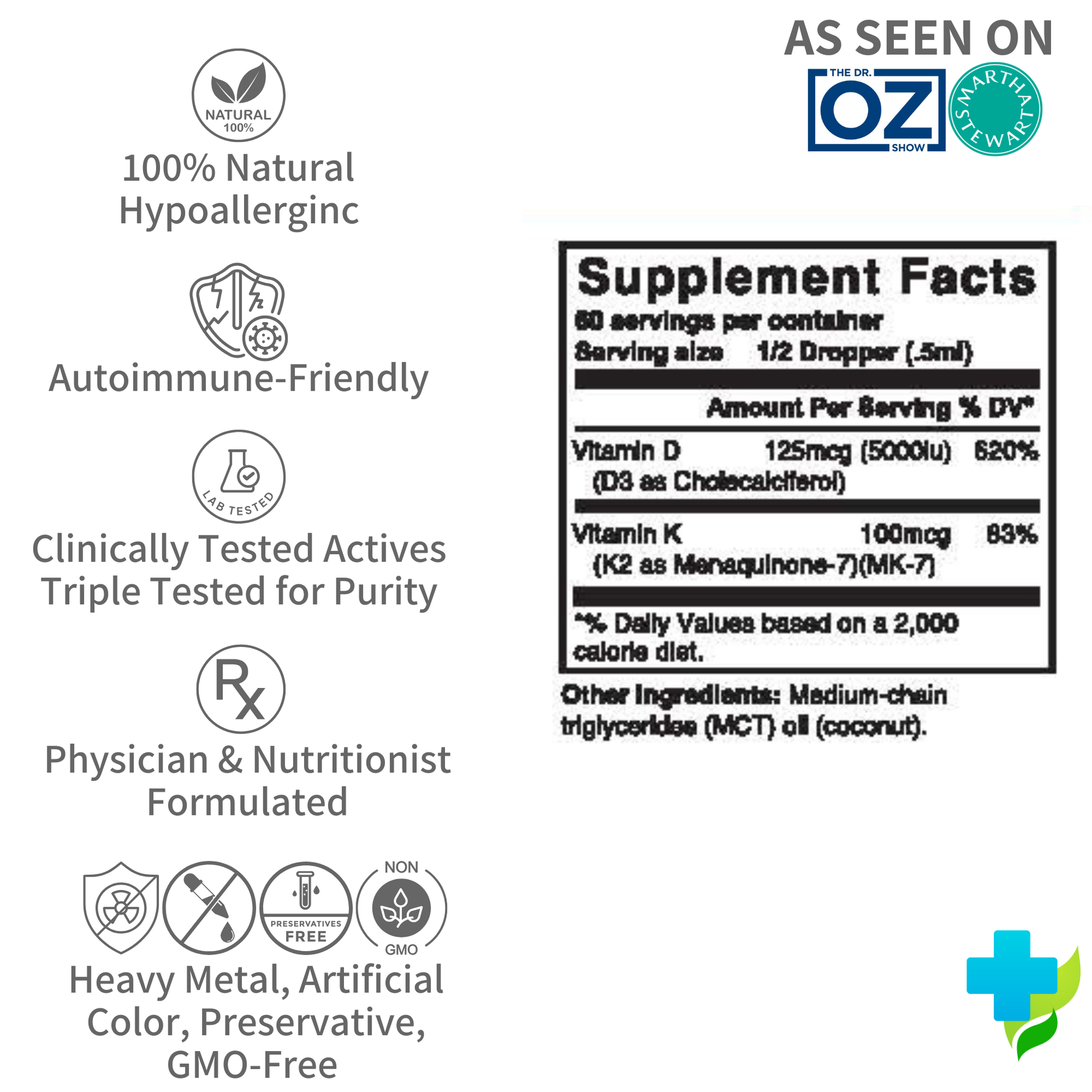 Pure, potent (maximum strength) liquid drops. LynFit Liquid Vitamin D3 + K2 liquid drops have the highest bioavailability and even surpass injections because they are absorbed within 4-7 seconds when placed under your tongue, and they have superior bioavailability when reaching areas of your body that need it most.